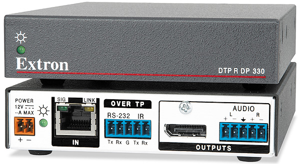 - Receives DisplayPort plus control and analog audio up to 330 feet (100 meters) over a shielded CATx cable